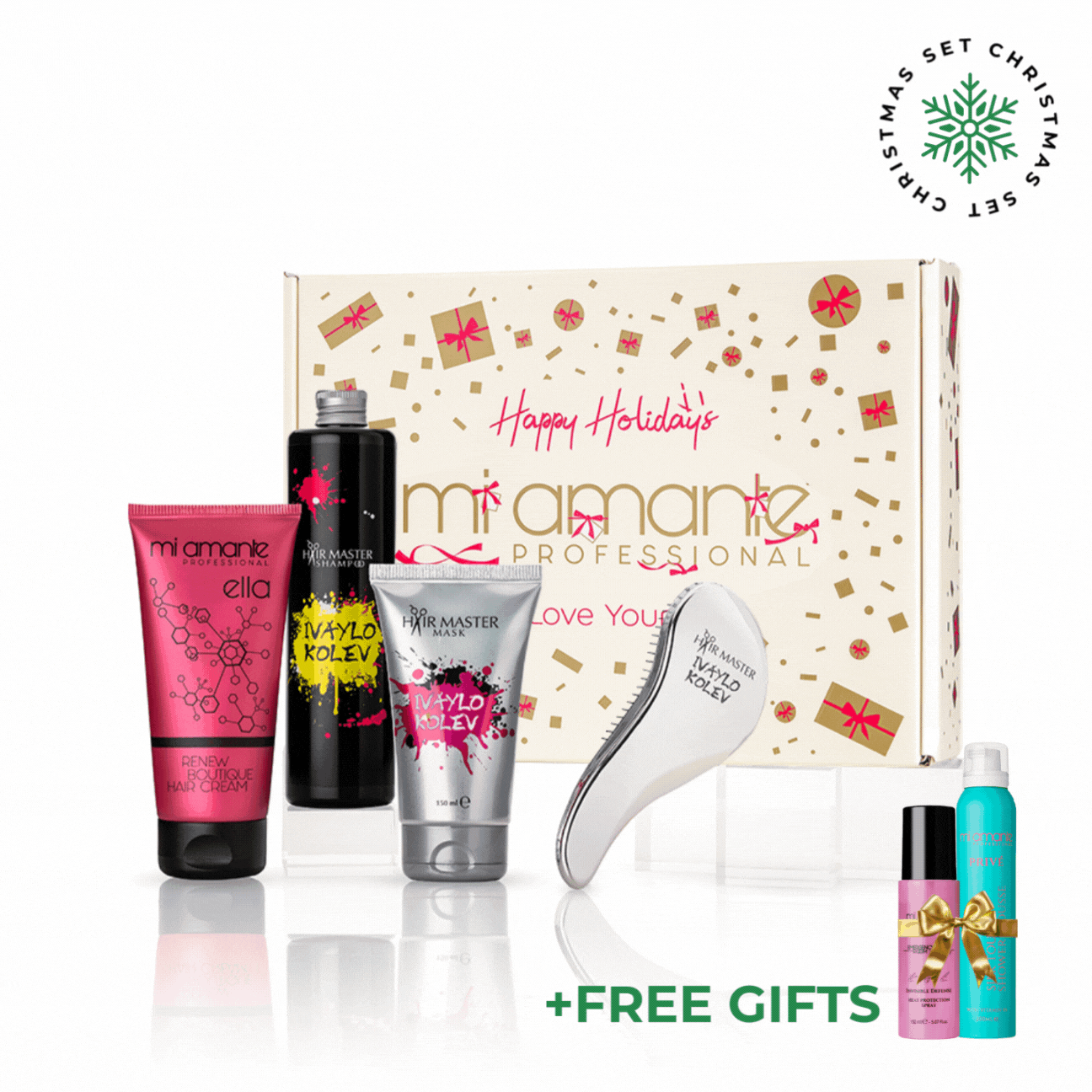 Ivaylo Kolev Hair Master készlet, amely tartalmazza az Ivaylo Kolev Hair Master sampont és maszkot, a Mi Amante Ella hajkrémet, valamint egy limitált kiadású Ivaylo Kolev hajkefét.