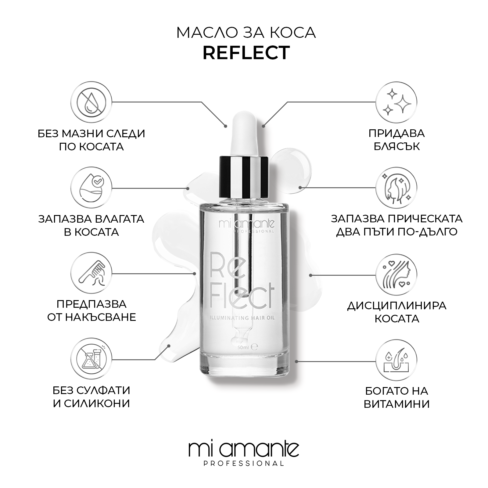 - Маслото ReFlect заглажда и запечатва краищата, придавайки завършек с огледален блясък, без да натежи дори на тънка коса.